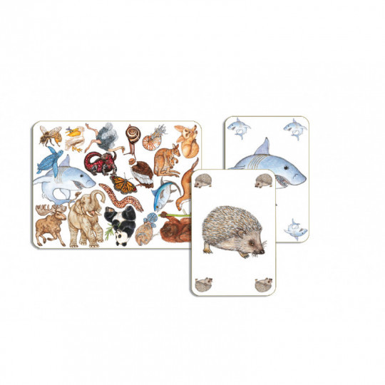Ett roligt spel där du måste vara observant och koncentrerad för att vinna. I början av spelet får alla spelare 8 djurkort och sedan vänder en spelare upp ett kort med en mängd bilder på djur i olika storlekar och vinklar. Bli först med att hitta något av dina djur på det stora kortet och lägga ner det motsvarande kortet på bordet. Var du först och kortet visade ett djur som faktiskt var med på det stora kortet så får du lägga bort detta kort, hade du fel måste du ta upp kortet igen och ta ytterligare 2 kort ur högen. De spelare som inte hann först ska ta upp sina kort igen, och så fortsätter spelet. Den som först lyckas bli av med alla sina kort vinner! Det går också att spela en lugnare version av spelet där ni istället räknar till 5 efter att ha vänt upp ett stort kort och sen vänder tillbaka det - sen lägger alla upp kort på de djur de tror finns med på det stora kortet. Spelet innehåller 72 kort (12 stora kort med blandade djur och 60 djurkort) samt spelregler på tio språk inklusive svenska.