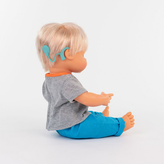 Babydocka blond europeisk flicka med hörapparat.