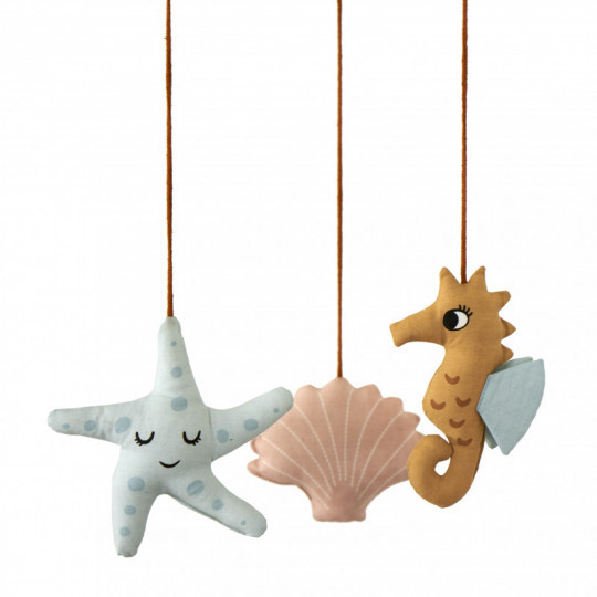 En snygg och kul ekologisk mobil med tre stoppade figurer från havet. . . . . . . Storlek hängande: ca 70 x 22 c.