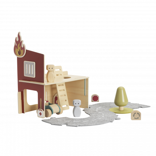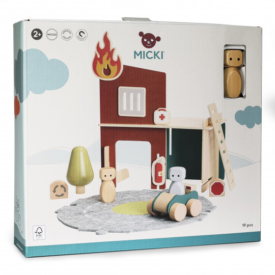 Kreativ och flexibel lekvärld. Med byggbara väggar, lekplatta, magnetiska frontväggar och magneter ges barnet de rätta verktygen att lätt komma igång med utvecklande lek oavsett ålder. De enkla formerna och de abstrakta figurerna skapar förutsättningar för att enkelt bygga upp sin egen fantasivärld - liten som stor. Kanske börjar leken runt räddningstjänsten som polis, brandman eller ambulanspersonal. Men efterhand kan fantasin få världen att växa och bli något helt annat. Micki Lekvärld Räddningstjänst innehåller: 5 väggar, 2 figurer, 1 stege, 1 träd, 2 vägskyltar, 1 bil, 4 magneter (eld, galler, brandsläckare och sjukvårdsväska) och 1 lekplatta i 3 delar i filt (rondell). Produkten ingår i en serie av olika lekvärldar och lekset som barnet kan bygga ihop, bygga ut och mixa hur hen vill. Det är bara fantasin som sätter gränserna! FSC-märkt trä.