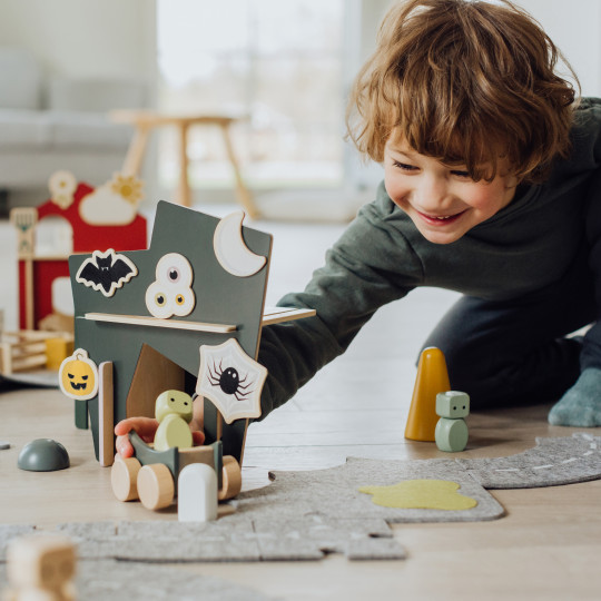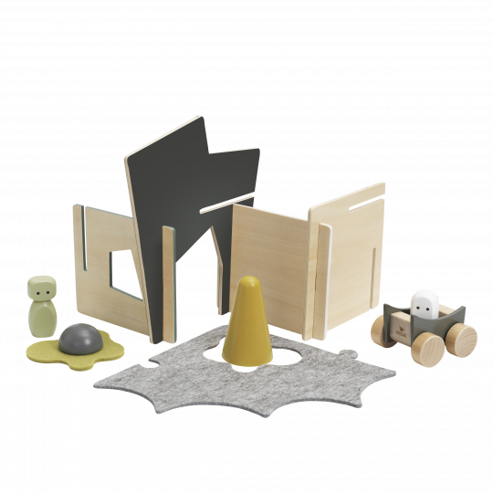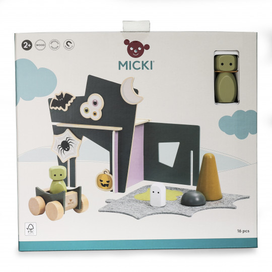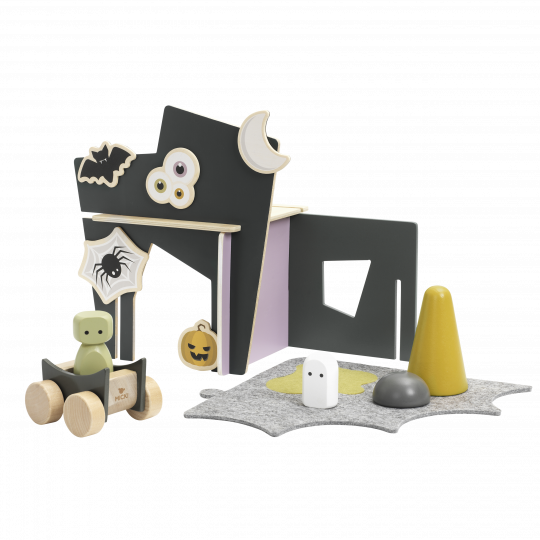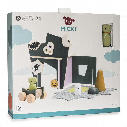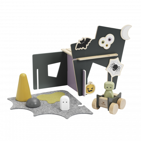 Kreativ och flexibel lekvärld. Med byggbara väggar, lekplatta, magnetiska frontväggar och magneter ges barnet de rätta verktygen att lätt komma igång med utvecklande lek oavsett ålder. De enkla formerna och de abstrakta figurerna skapar förutsättningar för att enkelt bygga upp sin egen fantasivärld - liten som stor. Kanske börjar leken runt spökhuset, men efterhand kan fantasin få världen att växa och bli vad som helst? Micki Lekvärld Monster innehåller: 4 väggar, 2 figurer, 1 bil, 1 träd, 1 sten/buske, 5 magneter (måne, fladdermus, pumpa, ögon och spindelnät) och 1 lekplatta i 2 delar i filt. Produkten ingår i en serie av olika lekvärldar och lekset som barnet kan bygga ihop, bygga ut och mixa hur hen vill. Det är bara fantasin som sätter gränserna! FSC-märkt trä.