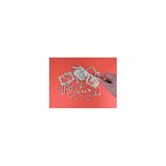 Varje kit består av 52 bitar på två skivor FSC-certifierad plywood. Varje ark är 13 x 17 cm och levereras i platta packningar och innehåller extra friformsbitar att experimentera med. Alla bitar passa ihop och varken spik eller lim behövs, så det är lätt att bygga, riva ner och bygga om i ny design. Använd färg, tyger, pärlor, eller annat pyssel för att dekorera dina skapelser.