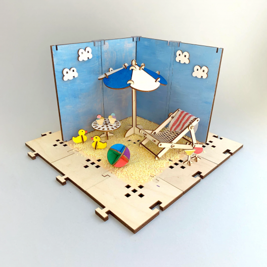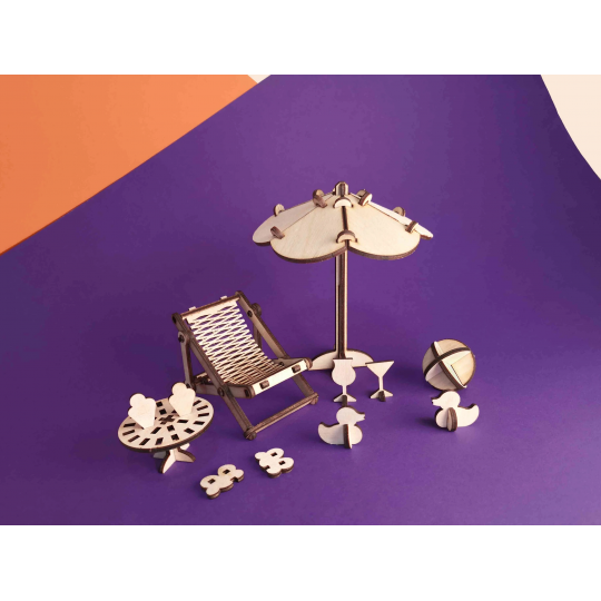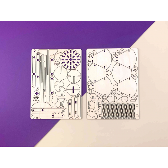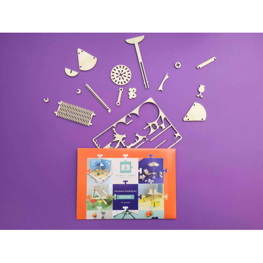 Varje kit består av 57 bitar på två skivor FSC-certifierad plywood. Varje ark är 13 x 17 cm och levereras i flatsförpackningar och innehåller extra friformsbitar att experimentera med. Alla bitar passar ihop och varken spik eller lim behövs, så det är lätt att bygga, riva ner och bygga om i ny design. Använd färg, tyger, pärlor eller annat att dekorera dina skapelser.