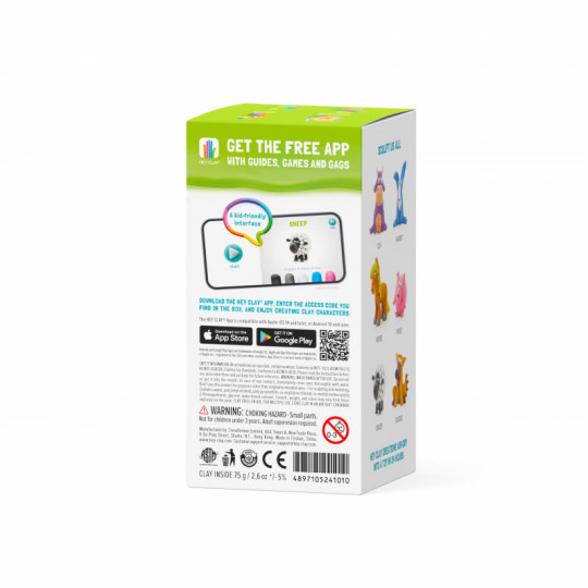 Ett riktigt kul och kreativt set med lufttorkande lera för att skapa ett roligt får av som du sen kan leka med eller dela bilder av med dina vänner. Detta set innehåller 5 burkar lätt, mjuk, elastisk och färggrann lera som kan ta form med hjälp av en gratis barnvänlig app med interaktiva video guider som har enkla steg-för-steg instruktioner (på engelska) för hur man skulpterar olika karaktärer. Du låser upp beskrivningen för fåret med en kod som finns inuti paketet. Låt dig inspireras av appen och skapa roliga karaktärer av den mjuka och färgstarka leran, låt figuren lufttorka i 24 timmar så kan du sen leka med den precis som en leksak eller dela bilder på dina skapelser med dina vänner. Guiden med steg-för-steg instruktionen visar alla grundläggande tekniker för att skulptera i lera och snart kommer barnen längta efter att skapa sina helt egna figurer. Leran är lufttorkande, klibb-fri, giftfri, innehåller inget vete och har klara, livfulla färger som går att blanda ihop. Tvätta händerna efter användning och undvik att leran får kontakt med mun, ögon, mat eller dryck, vatten, fukt samt eld.