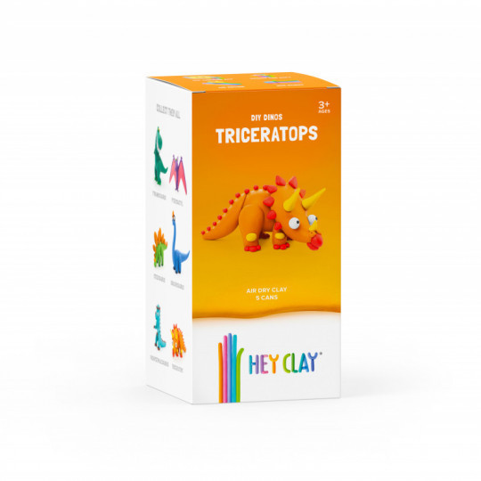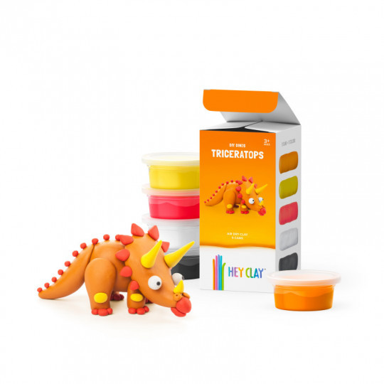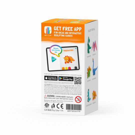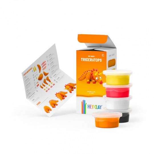 Innehåll: 5 burkar lufttorkande lera (totalt ca 75 g lera i 5 färger) samt ett informationsblad med bilder på dinosaurien, de olika stegen som krävs för att skulptera den, en länk till där ni kan hämta appen och koden som låser upp appens guide för hur man skapar sin triceratops.