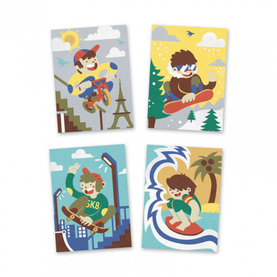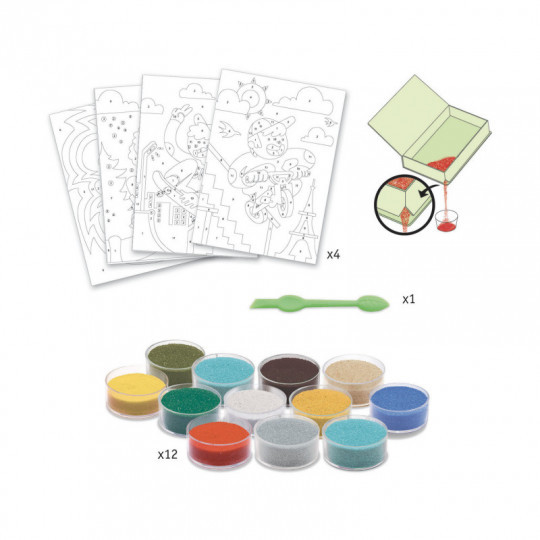 Färglägg med sand. Med det lilla verktyget som medföljer avtäcker man de limmade partierna. På de självhäftande områdena strös den färgglada sanden ut. Resultatet blir fantastiska bilder! Innehåller. . .