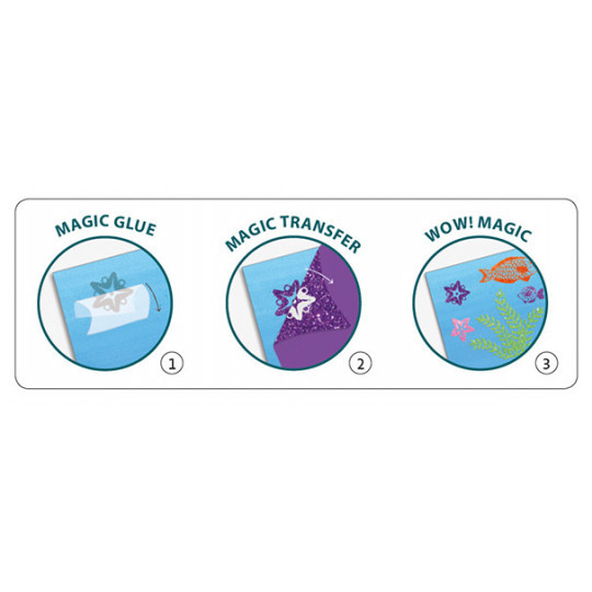 Trevligt dekorationspyssel för de kreativa. Med glittereffekt och fina havsmotiv. Först klistrar du fast det genomskinliga klistermärket som är \klistrigt\""" på båda sidorna, över den lägger du sedan dekorationspappret som fastnar i klistret. Resten lyfter du bort för att använda på andra märken. Kan användas för att dekorera kort, dagböcker etc. """