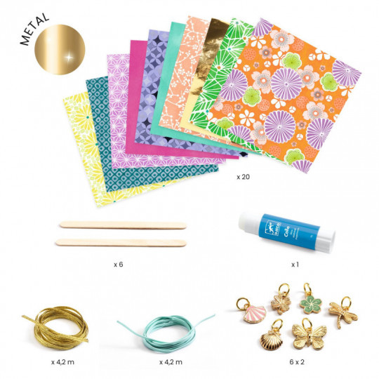 Innehåll: 20 ark av mönstrade och guldglänsande papper (19 x 19 cm), 6 små platta träpinnar, 1 rulle (4,2 m) guldfärgat resårband, 1 rulle (4,2 m) ljusblått resårband, 12 blandade hängen (2 av varje, i form av fjärilar, trollsländor, snäckskal och blommor), 1 limstift, samt ett häfte med inspiration och steg-för-steg instruktioner i färgbilder.