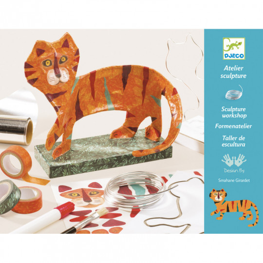 Ett nytt och annorlunda pyssel där man ska utgå från en ståltråd och i slutändan har en unik tiger figur. . Börja med att böja ståltråden till rätt form med hjälp av mallen, \fyll i\""" tigern genom att linda folie-remsor runt ståltråden, täck sedan hela tigern med orange washi-tejp och hela bottenplattan/stativet med grön tejp, pensla på lite lack för att allt ska hålla sig på plats och när det har torkat är det bara att sätta på klistermärken för tigerns ansikte, ränder och liknande så är du klar!. I setet ingår. ."""