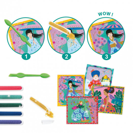 Ett vackert pyssel med minimala färgade pärlor som ger en skimrande textur till dekorationerna på dessa bilder. Bilderna har områden med klistrigt material, och pillar man bort skyddet får man en nedsjunken, klistrig yta att hälla ut pärlor i rätt färg på. . Setet innehåller. .