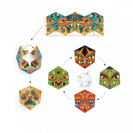 Roligt papperspyssel med en extra dimension. Vik ihop remsorna enligt instruktionerna och fäst ihop. Spännande moster att skapa och genom den magiska rörelsen får du sen fram ett annat monster, och ett till. Förpackningen innehåller 4 pappersremsor. Storlek på det färdiga monstret.