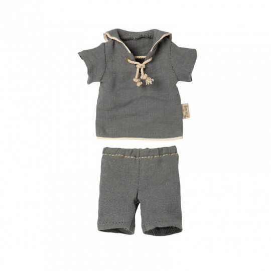 En mjuk liten kaninpojke med stående öron från danska Maileg. Kaninen är klädd en ljusblå seglarskjorta och shorts. Mått: 25 cm Tvättråd 30 grader