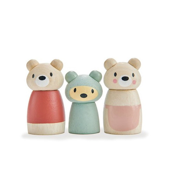 Lilla björnfamiljen är vansinnigt gullig och nallesnäll. Enkelt och rent formgivna med fint målade ansikten. Det står att de heter Bobby, Beryl och Cub, men du kan döpa dem till vad du vill. Ju fler namn desto bättre. Etiskt tillverkat i återvunnet gummiträ och målat med vattenbaserade färger. 10 x 4 x 6 cm +3 år pga små delar