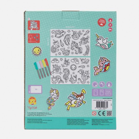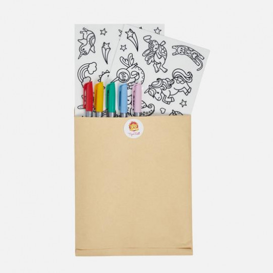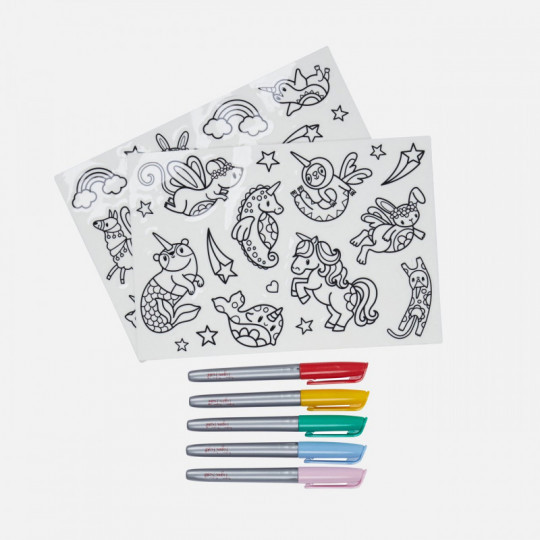 Ett roligt pysselkit med lite kraftigare klistermärken som skall färgläggas. Klistermärkena är flyttbara. Setet består av 2 ark med klistermärken samt fem pennor.