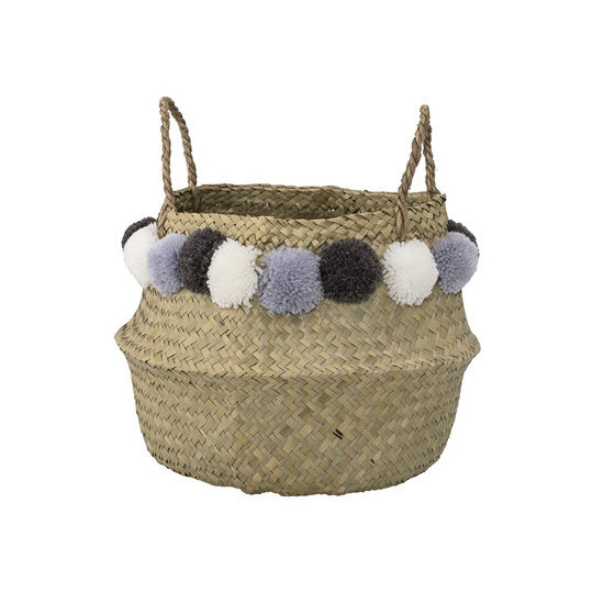 Förvaringskorg tillverkad i sjögräs med härliga pom poms i garn fästa runt kanten.