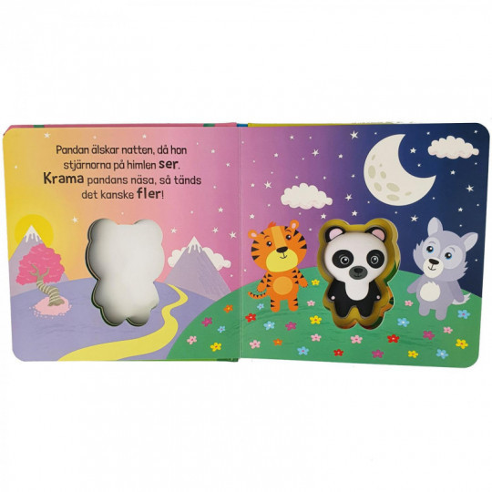 Träffa den kramgoa pandan och hennes vänner i denna söta sagobok på rim. Boken har kraftiga sidor i kartong. I boken sitter en mjuk panda fast. Den kan man klappa på och trycka på och den följer med från sida till sida.