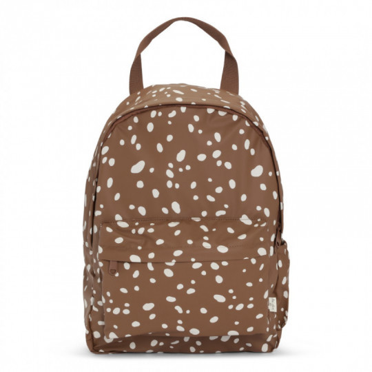 Superfin ryggsäck från Konges slöjd. Ryggsäcken har ett stort fack och ett lite mindre fack inuti med plats för pennor och småsaker samt ett ytterfack. På sidan av ryggsäcken finns det plats för en vattenflaska. För att inte axelremmarna skall glida ner finns det ett spänne som man knäpper över bröstet. Ryggsäcken är regntät. Storlek: 35x31 cm