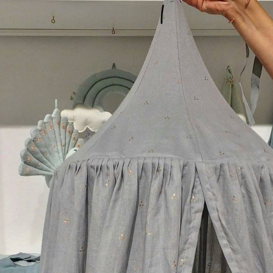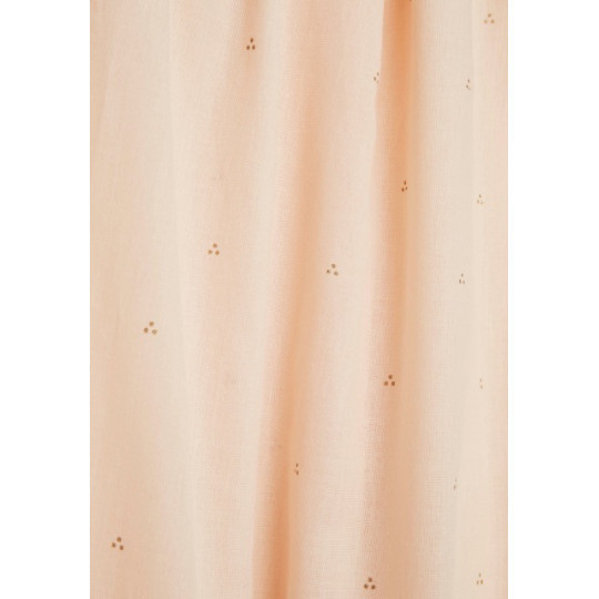 Vacker lite nättare sänghimmel från Danska Cam Cam Copenhagen. Sänghimmeln är fäst på en metallring genom enkla band som man knyter, lätt att ta av vid tvätt. Tyget är ljust aprikos rosa med små guldprickar.