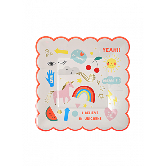 Söta engångstallrikar med enhörningar och festligt tryck som passar perfekt till festen med enhörnings-tema! Engångstallrikarna har en vit botten, en klar, korallrosa kant formad i volang och ett färgglatt mönster som ger det där lilla extra. Tallrikarna passar perfekt till födelsedagskalaset, middagen med kompisarna, baby showers, picknick och eller till andra festliga tillfällen!