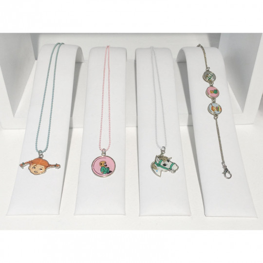 Allas prickiga favorit-häst finns nu som halsband! Ingrid Vang Nymans härliga illustration blir ett jättefint hänge på en vit kedja med klolås. Hänget är i metall med högglans-lack på framsidan. Halsbanded kommer i en fin ask med tittfönster. Det finns även halsband med Pippi och Herr Nilsson.