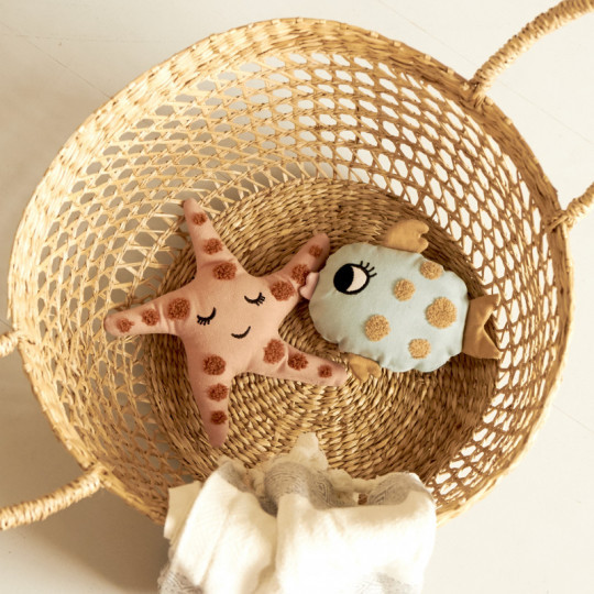 En kul ekologisk skallra i form av en gammelrosa sjöstjärna med fluffiga prickar i rosa-brunt och ett nöjt leende samt blundande ögon. Formen gör det enkelt för små händer att greppa den. Broderad design på ekologisk bomull med polyesterfyllning. Vid behov kan skallran tvättas i 30°C skontvätt och hängtorkas.