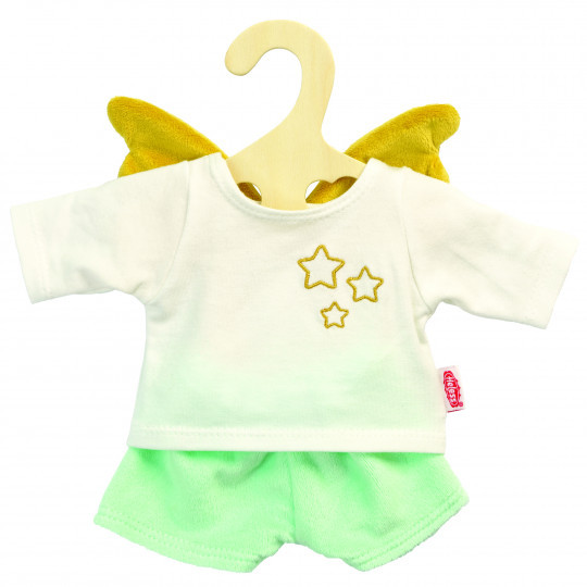 Klä din docka som en liten skyddsängel. Gosigt set med turkos shorts och vit tröja med guldfärgade vingar på ryggen.