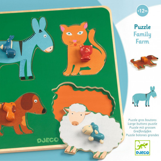 Fint pussel i trä med underbara knoppar som är små figurer av djuret på pusselbiten. Pusslets motiv är välkända djur som t ex hund, katt får. Målat med fina, giftfria färger. Storlek: 21 x 21 x 2 cm. Från 12 månader