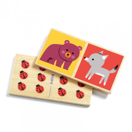 Ett sött domino spel för de yngsta med temat vilda djur i skogen. Spelet har två sidor: en av brickornas sidor har bilder på olika djur medan den andra sidan har siffror visade som ett antal nyckelpigor (som prickar på en tärning). Barnen ska lägga ner brickorna med samma djur eller siffra intill varandra i en logisk sekvens. Den spelare som först lyckas lägga ner alla sina brickor på rätt sätt vinner spelet. Ett perfekt pedagogiskt spel där barnen kan ha kul medan de lär sig olika djur, färger och siffror medan de förbättrar sitt logiska tänkande, sin förståelse för antal och matchande bilder, samt sin förmåga att koncentrera sig. Spelet har ordentliga bitar, på 9 x 5 x 1 cm, som är lätta att hantera för små händer och är tillverkade av FSC®️ certifierat trä. Innehåll: Domino spel med 28 delar av trä, förvaringsask. Från +2 år.