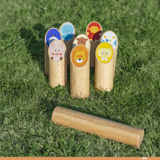 Kul trädgårdsspel för de yngre spelarna inspirerad av spelet Mölkky (nordisk trädgårds bowling). Trevligt spel tillverkat i trä, speciellt anpassat för små händer och yngre spelare, med förenklade regler. Ställ upp de fint målade "käglorna" med djuransikten på lagom avstånd och försök slå ner dem med kastpinnen. Medföljer gör en tygkasse att förvara och transportera spelet i.