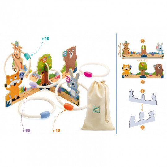 Ett sött och kul spel där ni ska kasta rep-ringar på ett mål med ett träd och fyra djur som ger dig olika poäng - ett klassiskt spel med en ny djurisk design. Svårigheten bestäms genom hur långt bort målet placeras och hur många ringar var och en får kasta. Spelet lär barn (och andra) att uppskatta avståndet till ett föremål och hur mycket styrka hen måste använda för att ringen ska landa runt en av figurerna. Målet är ca 43 cm brett, tillverkat av tjock plywood med figurer som är ca 17 cm höga och målets delar monteras enkelt ihop av en vuxen genom att lägga de illustrerade skivorna i kors och passa ihop delarnas urtag i varandra. Ringarna består av kraftigt rep som sitter ihop i ett handtag av trä målade i olika färger, och alla delar till spelet förvaras enkelt och kompakt i den medföljande påsen av bomullstyg. Innehåll: 1 mål bestående av två illustrerade skivor att sätta ihop, 5 ringar av rep med trähandtag i olika färger, 1 förvaringspåse av bomull med dragsko. Från 4 till 8 år.
