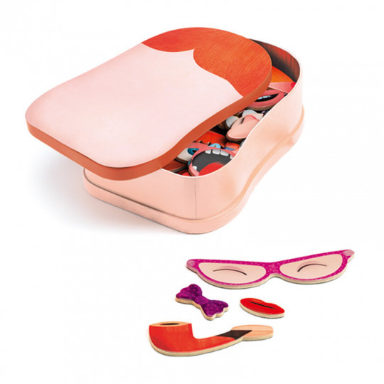 En metallåda fylld med trä-magneter i form av olika ögon, munnar, accessoarer och liknande som man kan använda för att skapa roliga porträtt med. Lådans ena sida har brunt hår målat upptill och den andra sidan har rött hår. Innehåller 38 st magnetiska delar. Lådan är 14 x 20,4 x 5,5 cm. Från 3 år