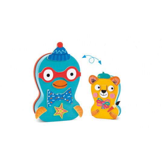 Figurformad metallåda fylld med trämagneter som gör att man kan förvandla lådan till en mängd olika figurer. Du kan använda båda sidor av lådan, och sidorna har olika färg. Innehåller 44 delar. Från 3 år.