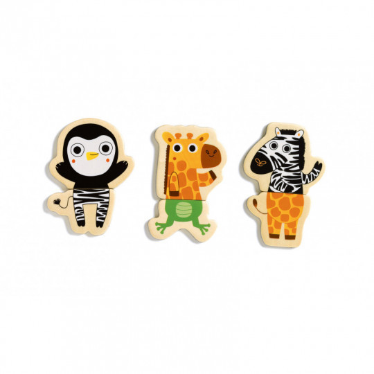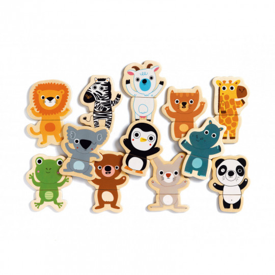 Magnetiskt träpussel att använda på kyl eller andra magnetiska ytor. 12 fina djurmotiv i två delar att pussla ihop, eller varför inte skapa dina egna fantasidjur? Innehåller 24 delar. Från 2 år