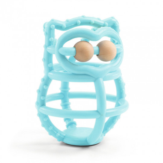 En rolig uggle-formad bitleksak av mjuk silikon med två ögon av trä. Leksakens öppna konstruktion gör det enkelt för bebisen att greppa den och de upphöjda mönstren på delar av ugglan masserar tandköttet och ger lindring när tänderna börjar växa. Leksaken kan stå upp av sig själv och de två träkulorna går att snurra på för extra underhållning. Ugglan är mjuk och flexibel, så den återfår formen även om den pressas ihop eller viks. Tillverkad av mjuk silikon och FSC®️ certifierat trä. Från +0 månader. Storlek: ca 10 x 8 x 8 cm.
