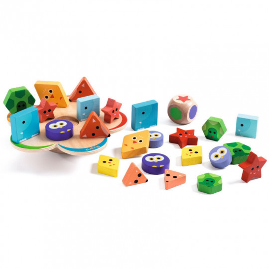 Ett kul och spännande spel för de mindre barnen där de ska balansera färgglada geometriska former målade som djur på en skiva formad som en blomma. Då blomman balanserar på en rundad bas är det inte alls så lätt som det låter, och innan dess ska barnet slå en tärning och välja ett djur med den geometriska form som tärningen visar. Det finns många sätt att leka med denna leksak, ensam eller i grupp och från helt fri och regellös lek till en spännande tävling där den som till sist råkar välta ner alla bitarna från blomman förlorar. Dessutom ger det en bra möjlighet till att lära in olika färger och geometriska former, förutom att öva på finmotorik och förståelse för balans med mera. Innehåll: 1 blomma i trä med rundad botten, 1 tärning i trä med färgglada geometriska former samt hela 24 geometriska former i trä, målade med giftfria färger. Detta är en FSC®️ 100% certifierad produkt. Från 3 år.