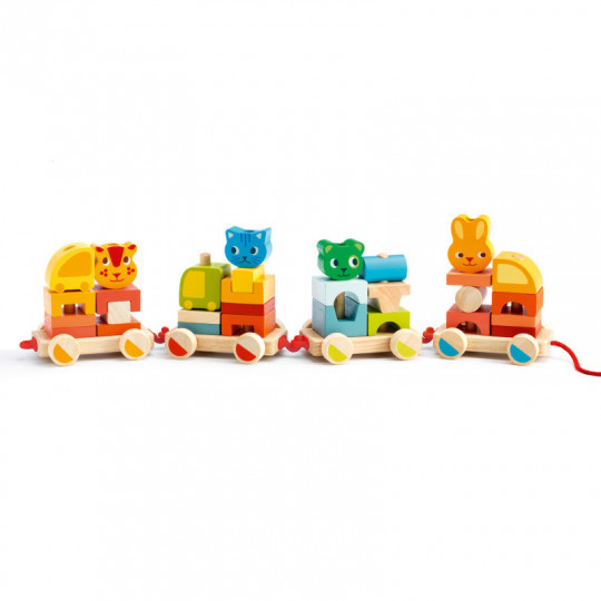 En kul dragleksak och byggklossar i ett! Ett färgglatt tåg med fyra vagnar som håller hela 30 stycken roliga träklossar i olika former som kan byggas ihop hur man vill, och fyra av klossarna är formade som djurhuvuden så att tåget har några passagerare. Varje vagn har två pinnar att trä klossarna på så att de inte trillar av på vägen, och då vagnarna är ihopkopplade med krokar kan vagnarna kopplas bort om man vill. Det finns många roliga sätt barnet kan bygga ihop det fina tåget och dra runt på det för att visa upp resultatet, men klossarna kan lika bra lekas med separat och har tillräckligt varierande former för att utmana barnets förståelse för balans och hur olika former passar ihop. Från 18 månader. Storlek: 61 x 10,5 x 10 cm.