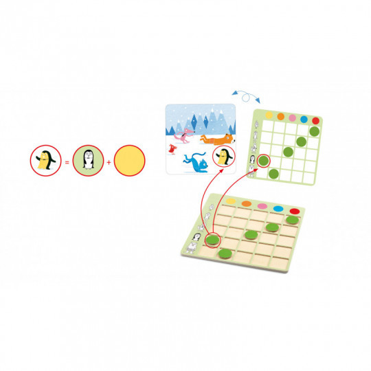 Ett spel för de yngre där de får chansen att öva sig på färger, djursorter och logiskt tänkande. Dra ett kort och markera i trätabellen vad de olika djuren har för färger på bilden. Den rätta lösningen finns på baksidan av kortet. Innehåller: 1 spelplan/tabell i trä, 5 trämarkörer och 20 olika motivkort. Från 3 till 6 år.