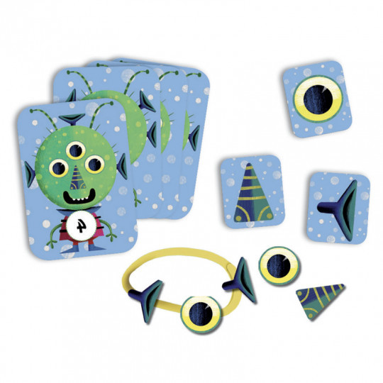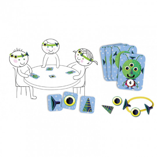 Ett roligt spel om marsmänniskor där det gäller att minnas hur man ska presentera sig korrekt, ha tungan rätt i mun samt ha koll på antalet ögon, näsor och öron man själv och andra har. Spelarna väljer varsitt av de fyra identitetskorten som visar en bild på den sorts utomjording du är och numret på planeten du kommer ifrån. En spelare i taget ska dra ett kort och utifrån det presentera sig enligt Zazannernas traditionella hälsningsfras och anropa en av de andra spelarna, men om hen säger ett ord fel eller i fel ordning straffas spelaren genom att behöva hänga en sak på sitt pannband. Exempel: Det är marsmänniska 2:s tur att spela, hen drar ett kort med ett öra och hen vill kalla på marsmänniska 4. Då måste spelaren säga EXAKT: Jag, marsmänniskan Zinzin från planeten Zaza nummer 2 med 1 öra, anropar marsmänniskan Zinzin från planeten Zaza nummer 4 med 3 öron. Det gäller att inte räkna fel på antalet delar på identitetskorten (ditt och kortet för den spelare du anropar), och att absolut inte säga fel någonstans. De delar som sätts på pannbanden måste sen räknas med av alla spelare i alla presentationer som innehåller just den delen. Du kan ju se de andras pannband men du måste själv komma ihåg vad du har på ditt annars kommer du snabbt att få många delar. Spelet slutar när någon av spelarna har 5 delar på sitt pannband och vinnaren är den spelare som har minst antal saker då. Innehåll: 4 identitetskort, 4 pannband med den mjuka delen av kardborrband, 24 kroppsdelar med kardborre-fästen att sätta på pannbanden (8 ögon, 8 öron, 8 näsor), 18 kort (6 ögon, 6 öron, 6 näsor) som visar med vilken del man ska presentera sig samt spelregler på 10 språk. Speltid: ungefär 15 minuter. Från +6 till 10 år. För 2-4 spelare.
