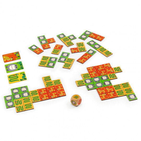 Det är panik i djungeln, flodhästarna, ormarna och geparder har blivit tokiga och stör lugnet i skogen. Hjälp till att återskapa naturens harmoni genom att skapa särskilda områden för varje art. Ett spel som kräver observation, snabbhet och en del taktik när ni väljer och lägger ner brickor för att skapa områden och vinna kort. Alla spelare spelar samtidigt med brickorna som kan ha olika form och storlek. Brickorna läggs i mitten med framsidan upp och en av spelarna slår med tärningen som bestämmer vilken sorts bricka ni ska försöka få tag på. Om tärningen visar ett djur måste spelarna välja en bricka som har detta djur och om tärningen visar ett överstruket djur ska ni välja en bricka som djuret inte är med på. Om två spelare vill ha samma bricka vinner den snabbaste, och om en spelare inte kan ta en bricka eftersom ingen kvarvarande bricka motsvarar tärningen så blir denna spelare utan bricka. När spelarna har tagit en bricka lägger de ner den framför sig och när man placerar en ny bricka måste den vidröra minst en redan utplacerad bricka utan att överlappa någonstans och med motsvarande djur intill varandra. När en spelare lyckas lägga ut sina brickor så att de formar en rektangel på 2 x 3 likadana djur har spelaren skapat ett område och får då ta ett kort med detta djur. Den första spelaren som vinner tre av samma djur får bonuskortet för detta djur. Spelet är slut när alla tre bonuskort har vunnits, eller när ingen av spelarna kan ta någon bricka på bordet (alla kort som motsvarar tärningen är redan tagna). Då räknar man ett poäng per kort och den spelare som har den högsta poängen vinner spelet! Spelet är tillverkat av FSC® certifierad kartong och papper. Innehåll: 42 polyomino-brickor, 21 djurkort, 3 bonuskort, 1 tärning, spelregler på tio språk inklusive svenska, 1 förvaringsask. Från 6 till 99 år. För 2-4 spelare.