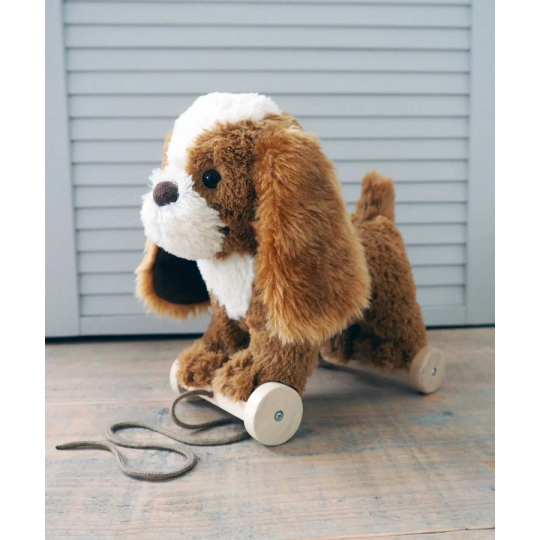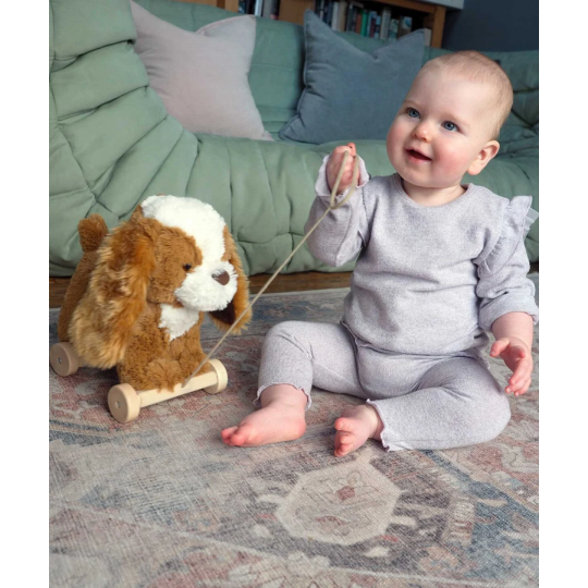 Trähjulen är fästa med kardborrband under tassarna och tas enkelt av och på. Snöret att dra med är fäst på de främre hjulparet.