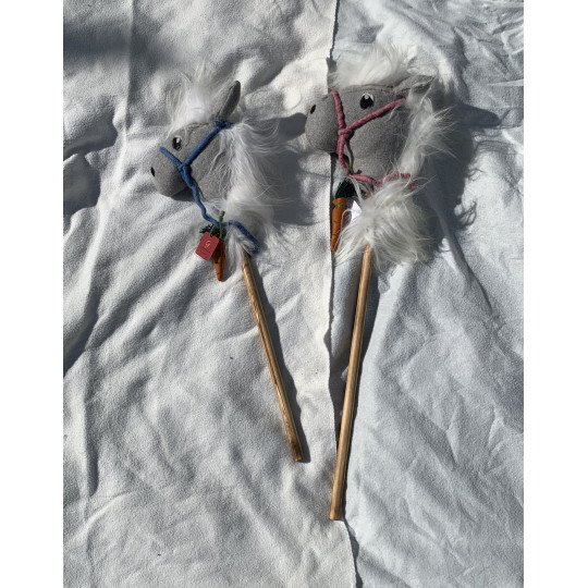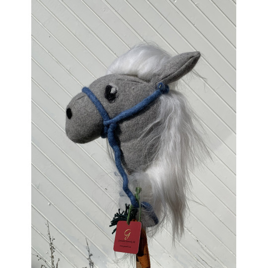 Det handgjorda käpphästfölet Tindra, grå med vit man. Medföljer träns och morot.