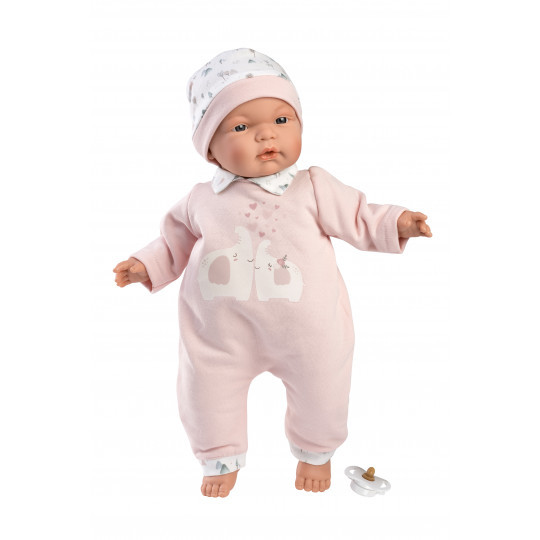 Florence är en mjuk docka utan ljud. Hon är klädd i en rosa sparkdräkt med tryck på magen och mönstrad mössa.