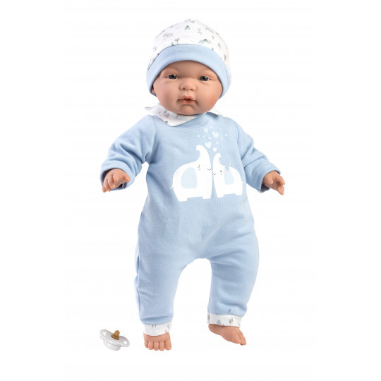 Flynn är en mjuk docka utan ljud. Han är klädd i en blå sparkdräkt med tryck på magen och mönstrad mössa.