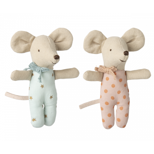 Ett klassiskt Maileg-objekt. Dessa tvillingmöss sover tryggt i sin sovsäck sida vid sida, instoppade i tändsticksasksängen. Mössen passar alla tillbehör i storlek babymus.