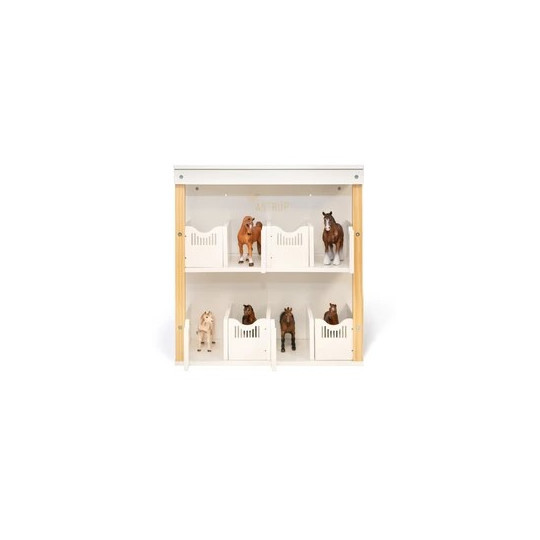 En perfekt förvaringslösning för barnets skatter! Med åtta hyllor med charmiga gångjärnsdörrar, precis som på ett riktigt stall, kan barnet förvara en mängd små olika figurer, från figurer till prydnadssaker. Designad för miniatyrhästleksaker, men båsen passar även Schleichs sortiment av djur.
