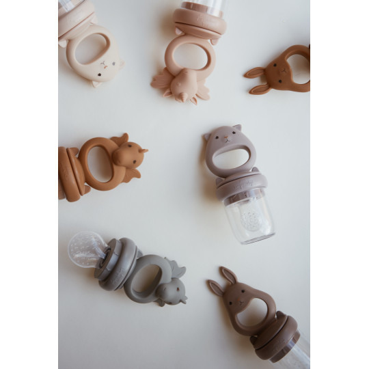 Provsmakningsnapp som ger barnet en möjlighet att smaka själva. Ergonomiskt handtag som barnet lätt kan greppa och små hål gör att det inte blir för stora bitar för barnet. Skyddskåpa medföljer.
