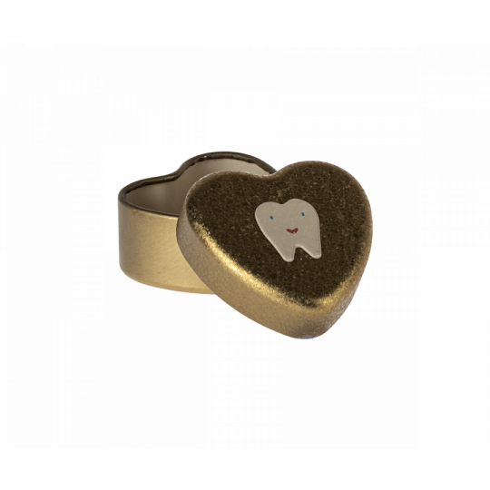 Detta fina metallhjärta i guldfärg är det perfekta stället att förvara t ex små tänder. Asken har en söt tand som dekoration på locket, som har en krackelerad yta.