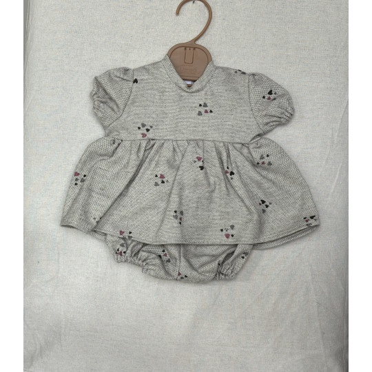 Grå kortärmad klänning och matchande underbyxor med ett hjärtmönster, samt sockar och hårband i rosa. Passar till Llorens babydockor i storlek 40-45cm.