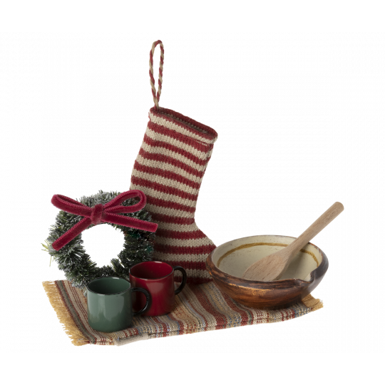 Ett set med alla nödvändiga tillbehör för en mysig jul. I den vackra presentförpackningen hittar du en liten strumpa, matta, krans, två koppar och en skål med träslev. Alla delar passar in i Pepparkakshuset och passar för musfamiljen.