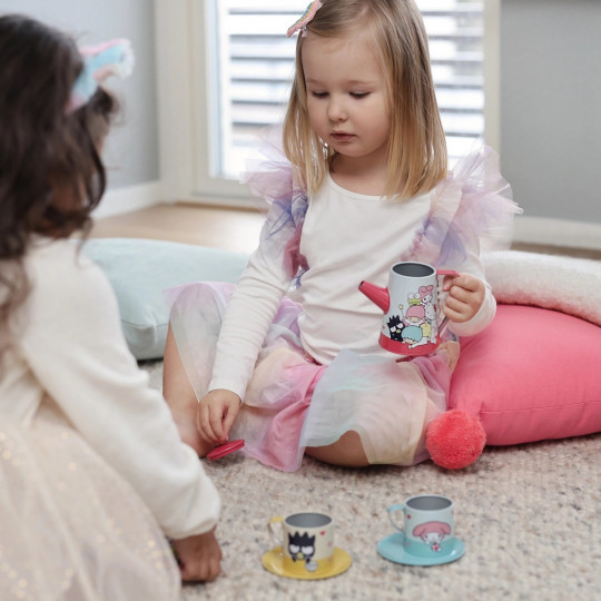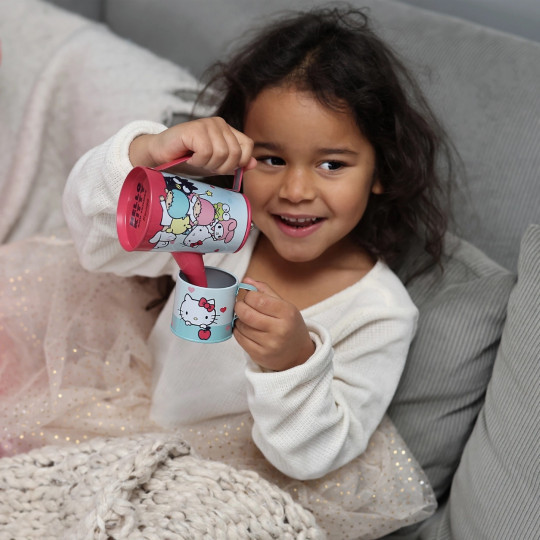 Duka upp till tebjudning med Hello Kitty och hennes vänner! Varje del i setet har en illustration på dom lekfulla karaktärerna från Hello Kitty and Friends. Setet innehåller en kanna med lock, 4 koppar och 4 fat. Denna tåliga leksaksservis inspirerar till fantasifull rollek. Vad fantiserar ni om att bjuda på idag? Låtsas-kaffet smakar extra smarrigt i dom här färgglada kopparna! Låt fantasin visa vägen!